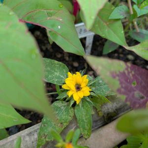 親指サイズの🌻ひまわりが咲きました 大きくなりきれなかったみたい。 ケイトウの陰になりひっそり咲いてます 可愛いひまわり