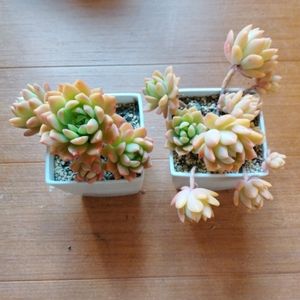 おはようございます。 2/16(金) 10-17 営業です。 本日は、店主は終日在宅予定です。 新入荷商品のご案内です。 左…だるま秋麗 200円 右…(たぶん)マッコス 200円 ちまちま屋産の苗です。 だるま秀麗は、ぷくぷくの葉が可愛いですよね💕 冬はほんのりピンクに紅葉するのですが、今年はほとんど紅葉してないですね… 右は名無しで来たけれど、たぶんマッコスだと思っているものです。 とても丈夫で、暑さ寒さともに強いです。 脇芽もたくさん出ますし、葉挿しもよく出ます。紅葉時のオレンジ色がとても可愛いです💕 写真2枚目は、我が家の花壇のマッコス?です。地植えすると大きくなり、子株もたくさん出ますよ。 寄植えにも重宝します✨ 今年はもう暖かくなりそうですよね… 例年は紅葉は4-5月頃まで楽しめますが、今年は醒めるのも早いかもしれませんね。 寄せ植えを作るなら早めをオススメします! どちらも一点のみなので、お早めにどうぞ。