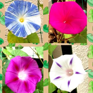 今日は、入谷の朝顔市の日だそうですが、コロナで2年連続中止だそうです。気になる方は通販販売もしているそうですよ。 我が家の4種類の朝顔が咲きました。 毎年、失敗するのは、花数が少ない事です。 調べたら、5~7枚の葉っぱになったら、蔓の先端を✂️するそうです。そうすると脇からも蔓が伸びて、花数が増えるそうです。やってみたら、脇芽がいっぱいになりました。