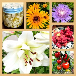 八重咲きカサブランカ、ホワイトアイズが咲きました。ゆり園中で、一番サイズが大きい百合です。 左上は、ドクダミチンキ。草の生え方が尋常でないせいか、よく蚊に刺されます。今年は3つ作りました。 お待たせしました😊 右真ん中は、ビーツのボテトサラダです。色が凄いでしょう。昨日はビーツ入りのボルシチに挑戦。「食べる血液」と言われているビーツ。乾燥に弱いので、暑くなる前に急いで収穫です。