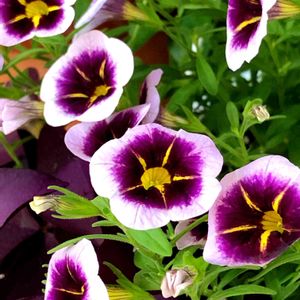 一目惚れの花。中心が濃い紫色で、黄色の模様が入っています。ペチュニアかなと思いましたが、どうやらカリブラコアのようです。 ペチュニアの近縁種で、ナス科カリブラコア属のカリブラコア。名前を間違えずに覚えるのに大変💦長く咲いてくれるみたいなので、大切に育てていきたいです。