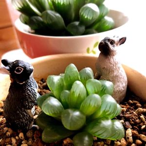 我が家のハオルチア・オブツーサ。 手前はソーシャルディスタンスするウサギ達。「最近の変異株、デルタ株、ミュー株、イータ株、カッパ株と、名前を覚える度に混乱するね。誰かが言っていたけど、台風みたいにコロナ何号にしてくれれば分かりやすいのだけれどね。」と会話しているみたいです。