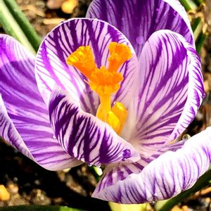白、黄色、淡い紫色、濃い紫色、白地に紫色のクロッカスが、やっと咲き始めました。その中でもこのクロッカスの鮮やかさは、目を引きます。季節外れの雪にヒヤヒヤしながら見守っていました。今年は葉っぱが枯れてから掘り上げて、増やしてみたいです。