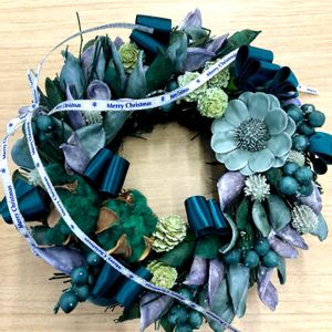 毎年この時期になると、フラワーアレンジメントでは、クリスマスリースを作ります。今回は自然素材をワックスコーティングしたリースです。テーマはフランス語のエテルネル(永遠)とボーテ(美しさ)からエテルボーテ(半永久的な美しさ)です。 豆のさやの形をしたマンゴーポットに、グリーンやグレイのワックスを塗って、艶のある落ち着いた感じになっています。繊細なXmasリボンを外せば、1年中飾れるスグレモノ。左下のコットンの綿をグリーンに染めることで、一体感が生まれました。