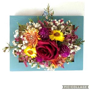 ごろちゃんさんと約束していたドライフラワー、やっと飾れました😆 フォトフレームの板に、オアシス(アレンジメント用の給水スポンジ)を木工ボンドで貼って、ドライフラワーを挿していきます。壁掛けなので、場所を取りません。 お花は、今年1年で作ったドライフラワーの薔薇、ヘリクリサムコロロ、千日紅、スターチス、ワックスフラワー、カスミソウです。