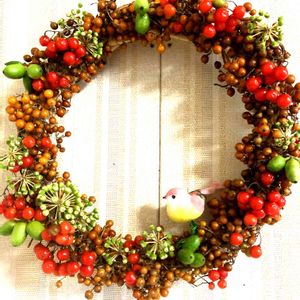 秋の実をいっぱい見つけたので、リースにしてみました。 黄金色のへクソカズラの実。赤いヒヨドリジョウゴ。まだ赤くならないライムグリーンのアオキ。花から黒い実になる前のヤツデの実。100均で購入したリース型と、ピンクの小鳥を付けて完成です。