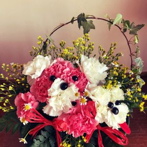 母の日のアレンジメント。 カーネーションを使って犬と熊にしてみました。毎年、このアレンジメントは、大人気です。自分で作る時は、熊は、カーネーション8本、犬は6本必要ですよ。