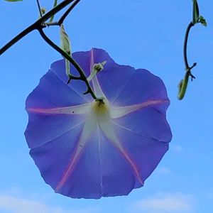 西洋朝顔ヘブンリーブルー。 澄み切った青空に向かって、咲いています。後ろ姿と空を見て、ほっこりしました。 西洋朝顔は、短日植物の為、日が短くなってから咲き始めます。