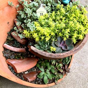 割れた鉢を使った多肉の寄せ植え、ブロークンポット。やっと出来上がりました。 多肉の土を使ったので、形が崩れないか、作る時もドキドキ。 階段の部分の多肉は、まだ生え揃っていないので、これからどうなるのか楽しみです。