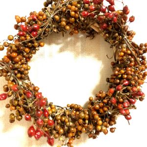 葉っぱや実を潰すと臭い匂いで有名なへクソカズラ。この匂いは、スカンクのガスと同じだってご存知でしたか。 秋は、実が鶯色から黄金色に変化して、綺麗です。今回は実をリースにしてみました。 <作り方> ①実は軽く水で洗って、日陰干し。 ②100均の小さいリース型を購入。型に巻き巻きして、所々ワイヤーで止める。 ③ドライフラワーにしていた野ばらの実を束にして、4箇所止めて完成。 全体に暗めなので、赤い秋の実を入れて華やかにしてみました。初心者なので、リース型は、小さめにしてみましたよ。