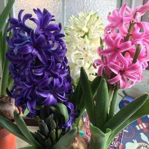 ヒヤシンスの芽出し球根3色💜 いつも行くスーパーにたまに苗が仕入れてあります。 先週の木曜日ピンクのをお花屋さんで買ったばかりなのに土曜日にスーパーで発見❣️この時は我慢しました😅 今日買い物に行ったらまだ数鉢ありました✨ ワンコインならいいよね(*^^)v ちょっと病気発症したかな💦 ヒヤシンスに取り憑かれてしまいました(´∀`;) 出窓に置きましたが、今のところ誰も気がつきません(´×ω×`)サビシイ