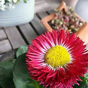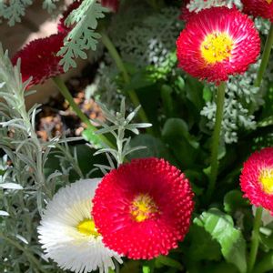 寄せ植えから٩( ᐖ )۶ チロリアンデージー紅白❤️🤍❤️🤍 赤の勝ち❣️ 見えてないところで白い子は お昼寝中です 強風のために倒れちゃいましたか♪̊̈♪̆̈
