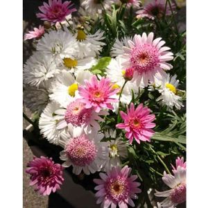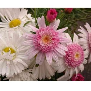チロリアンデージーの白花と ピンクが可愛いマーガレットシェリエメール。 雨上がりでしっとり濡れています( ^ω^ )
