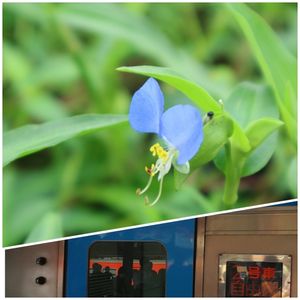 暑くなってきました ただいま岡山駅🍑 今日は所用があって実家から徳島まで日帰り旅です。 母の故郷 高知に行くにはいつもこの土讃線特急南風でした。 特急南風と露草。懐かしい夏の思い出がきらめく青。 🚋キタキタ~💦乗ります‼️