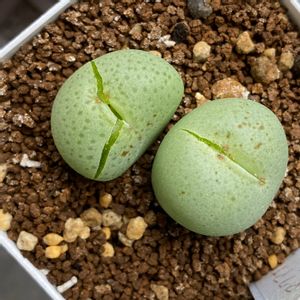 ガビーン😬💦💦💦 今見たら身割れを起こしていました💧 数日前の水遣りに今日の雨の湿気で水分吸い過ぎたのでしょうか😭 明らかに脱皮とは違う🥲どうなるのか⁉️ 他の子達も幾分膨らんで大きくなっているような気がする😥 💗ナマカナム ✨Conophytum namaquanum✨