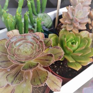 こんにちは(*´ー`*)✨ 先日29日ホムセンの多肉の日に 伊達法師を狩ったので もうひとつアエオニウム寄せ植えを作りました 他の鉢からチョン切った✂️パールネックレスを隙間に足しました