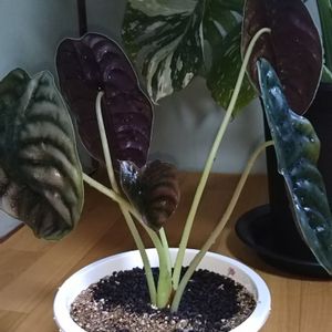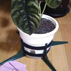 アロカシア クプレア様 8月に軟腐病で枯らして再度迎え入れた子。 前回の反省点は届いたその日にいきなり5号鉢から10号鉢に植え替えたこと、結構日当たりいい暑い部屋に置いたこと。 で、今回届いたまんまの状態でリンゴ木箱の中に入れて様子みてましたが、今度は日当たり悪すぎたみたいで。。。。 慌てて窓全開の部屋に移動させて様子を見てたところ、猫達がプロレスして倒してしまいました。。。。。。 災難続きのクプレアですが、観葉植物用の土に今朝植え替えました。 モンステラの横に置いてます。 なんとか頑張って~