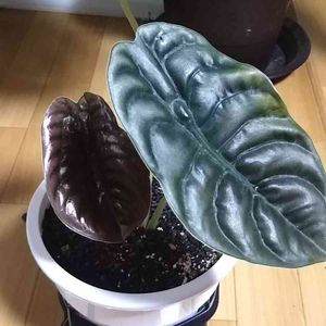 *⑅︎୨୧┈︎┈︎┈︎┈︎୨୧⑅︎* おはようございます❁ 今日は キモカワ な アロカシアのクプレア キモカワというか カワはない。 な。。。 ゾクゾクします。 メタリックな色はカッコいいのですが。 一番新しく開いた葉は手のひらより大きく。 なかなかの存在感を放っております。 2週間ほど前か、 サトイモ科どくとくの花が咲きましたが、 なんとも。(笑) もう少し、控えめでもいいのですがね^^;