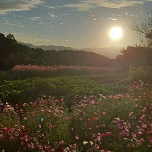 今朝のウォーキング中の景色🚶 満開のコスモス畑💐
