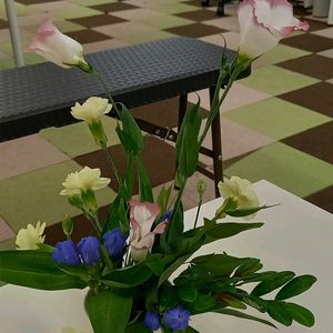 今日は残った花をガラスに生けただけ💐 花のある生活、花のある職場は私の理想😊💐