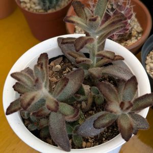 【うさぎの耳】 ウッドキューブSmallーチョコ カランコエ属"黒兎耳" 黒兎耳は"クロトジ"と読みます。 黒兎と呼ばれる事もあります。 特徴は ウサギの可愛い耳に似た葉を持ち 産毛が葉全体に生えています。 また、蕾にも 産毛が生えていて可愛いです。 種類によって手触りが違うので 触り比べをするのも楽しいです。 カランコエ属は寒さに弱いです。 氷点下に当たると凍傷します。 室内で管理すると良いですよ☃️ 成長期は夏型(春〜冬に成長) 横に広がりながら上に伸びます。 代表的な多肉植物 黒兎耳は黒うさぎ 月兎耳は白うさぎ また、白黒で飾るのも 可愛いなーと思います。