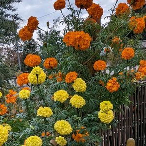 オレンジとイエローのマリーゴールドこんなに大きくなるのですネ 畑の垣根になって咲いていました。