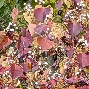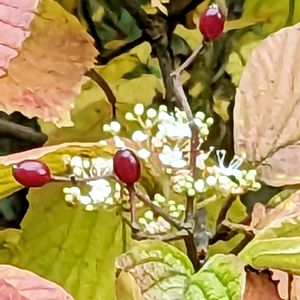 ガマズミのお花と実がなる光景 実がな付いているのを見ていたら1つの枝にお花と 実が一緒になっていました。