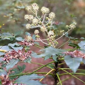 今日のお花 ヤツデ八つ手の大きな葉 の上にモミジ枯れ葉が 沢山乗ってます。