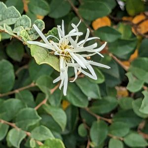 街路樹にトキワマンサクが1輪咲いていました。 季節外れに 前は狂い咲きた言ってましたが 今は禁止用語だそうです。 何と表現すればわかりやすいかしらネ