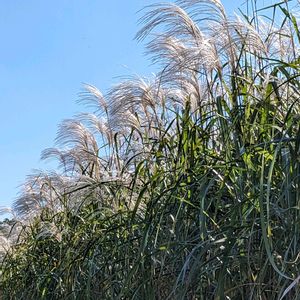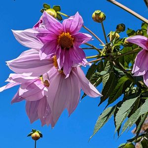 青空に皇帝ダリア 早く咲かないと 霜が降りるとペチャベチャに枯れてしまいますよ 綺麗ですネ