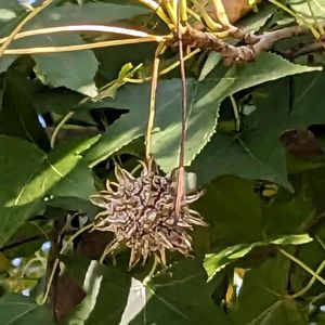葉が寂しくなると モミジバフウの実が目立つできます。 小鳥トゲトゲの実をつついています🍁