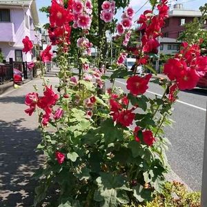 街路樹の下にタチアオイが 色とりどり暑い日差しの中 すらりと立ち咲いています💞 綺麗なお花ですね💞