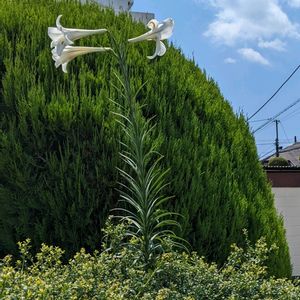 近くの学校の校門にツゲの生垣の中から2メートル近くの高さの立派な 高砂百合気高さを感じます✌️