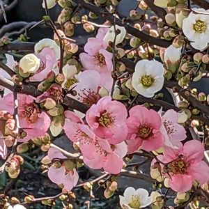いつも通る道他所の庭の隅で咲く木瓜の花 お花が咲くと華やかですネ