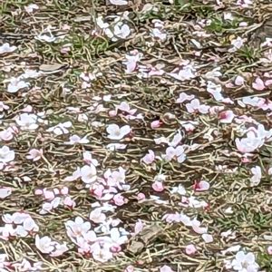 ワカケホウセイインコが大群で蜜を吸っています。桜の下は花ごと落ちた桜で真っ白です。 嘴のつき方が違うので 桜をバタバタと落としています。 追い払いたくなりました苦笑