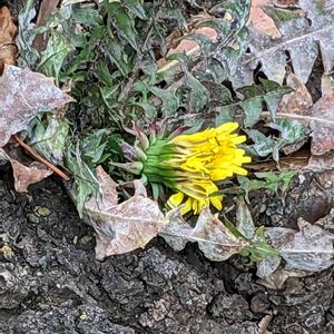 桜のうろの中で咲くタンポポ