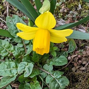 公園の枯れた芝生の中で10センチもみたない茎でお花を咲かす水仙可愛し健気