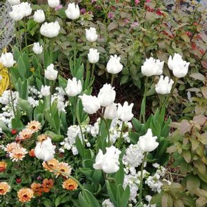 気になったチューリップ🌷 八重咲きのフリンジ咲き 真っ白で清楚な清々しい感じ 背丈も低くて薔薇?!って話してる人いらっしゃいましたよ😁 お名前 スノークリスタルというそうです✨ピッタリですね💕 なばなの里です♪