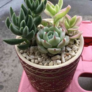 ベルム🌸開花の お知らせをいただき あまりの可愛さに ゲット💕 奥の ツメレンゲさんも 一緒に 捕獲〜🌱🌱 一寸の鉢にギューッと詰まってました🤗