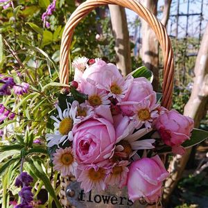 今日の花束💐 持って行きやすいように袋に入れるのモタモタしてたら…… 「今日は花は無いの? うちで持って行かないと何も花が無いんだもの~」って😅 もう薔薇🌹終わるって言ってるのに~(〃艸〃)