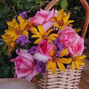 今日の花束💐 オデュッセイア🌹にヨメナを🎵 ヨメナって昔は道端に咲いてた花だから懐かしんでくれるかな🎵