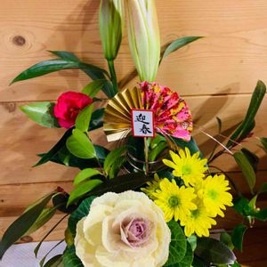 キレイなお花たくさんGET🌸農大市 素人なりにお正月っぽく生けてみた🤣 まだまだあるから母へ持っていこう〜