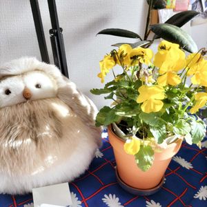 ビオラと正月飾りを買いました✌️ 紅白のお花と葉牡丹🌼散歩で良く見て憧れてたので買えたの嬉しい❤️ 敷いてる布と黄色の対比が可愛くてお気に入りスペースがまたさらに好きになりました〜✨