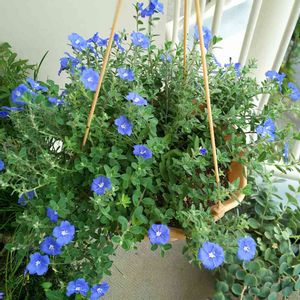 今朝のベランダ♡ 2019-07-04 植え付けた エボルブルス ブルーシエル ヒルガオ科 エボルブルス属 非耐寒性宿根草 ブルーシエルはフランス語で青い空という意味 アメリカンブルーより明るい色合いでエボルブルスの園芸品種 耐暑性が強く日照を好む 冬になると生育はほとんど止まり半休眠状態で葉色も悪くなる 水やりの回数を減らす