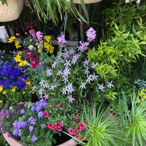 いい天気なのでお昼休みは外に買出しに。通り道に雛壇のお花いろいろ❣️ 真ん中の紫はイソトマかな?