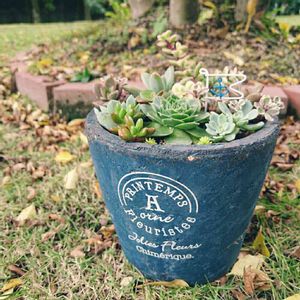 友達Iちゃんにもらった青いポットに、友達Bちゃんが作った青いワイヤーピック。家にありもんの多肉を寄せ植えというか…寄せ集め植え(丿 ̄ο ̄)丿
