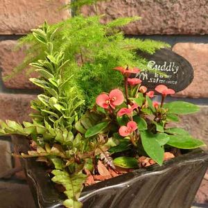 なぜか観葉植物の寄せ植えを作ってみたくなり…。 観葉植物コーナーにあった子達を使ったが、この赤い子(ユーホルビア…セリーナ)は果たして観葉植物なのかぁ!調べる前に植えちゃったけど( ̄▽ ̄;)