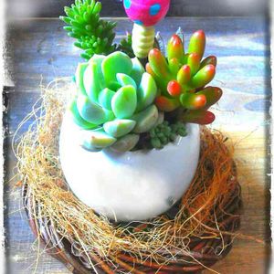 たまご型陶器に多肉をイン ピックはウッドビーズで作りました♪