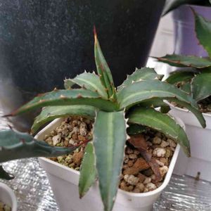 アガベ ロファンタ(🏷から) ロファンサ?ローファンサ?🤔 おはようございます。 暑さ、寒さに強いアガベ センチュリー・フラワーと呼ばれるほど 開花するのに時間がかかるらしいです。 10年以上⁇ 一度 見てみたいような…🌼 センターに斑が一本入っています。 上手く育てられるかなぁ…。