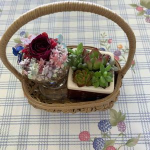 転勤する3名の若者へ ボタニカルキャンドル&寄せ植えを 籠に詰めて 差し上げた☘🌸